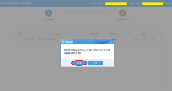 提交后,系統(tǒng)會提示“是否授權(quán)稅務(wù)機(jī)關(guān)向外匯銀行共享對外支付稅務(wù)備案相關(guān)信息?”。