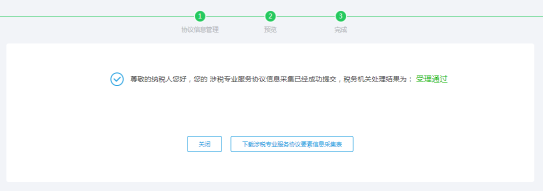 向主管稅務(wù)機(jī)關(guān)在線報(bào)送協(xié)議信息采集表。采集協(xié)議信息前需先完成機(jī)構(gòu)信息采集。
