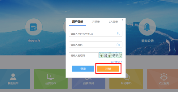 第二步:點擊登陸首頁 除:公眾服務(wù)、通知公告外的任意按鈕,彈出登陸頁面,點擊注冊按鈕。