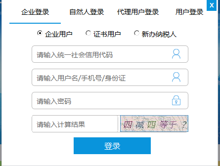 輸入企業(yè)統(tǒng)一社會信用代碼(納稅識別號)、登錄賬戶(手機號、用戶名、身份證)等、登錄身份對應(yīng)自然人密碼進(jìn)行登錄。