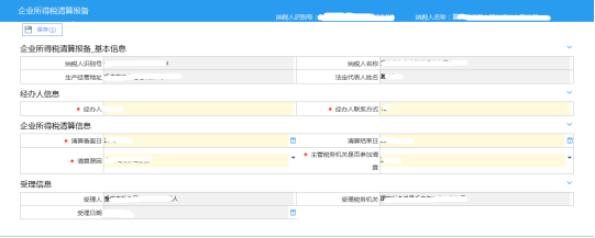 二、進入申請頁面后,填寫經(jīng)辦人信息以及企業(yè)所得稅清算信息,確定無誤后點擊“保存”按鈕。選擇的清算備案日應(yīng)為所得稅稅費種認定的有效期起。