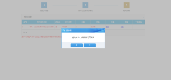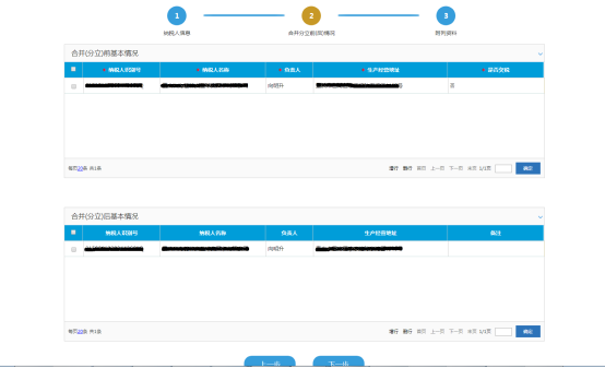 二、進(jìn)入申請(qǐng)頁(yè)面后,按提示填寫申請(qǐng)信息,確認(rèn)無(wú)誤后,點(diǎn)擊“下一步”。填寫納稅合并分立前后的企業(yè)信息,確定無(wú)誤后點(diǎn)擊“下一步”。如果報(bào)告類型選擇“吸收合并”或者“存續(xù)分立”,則合并(分立)后表格中至少需要錄入一條數(shù)據(jù)。