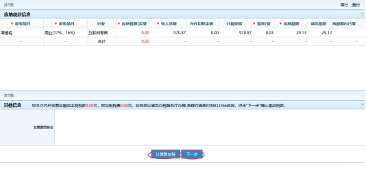 三、系統(tǒng)自動(dòng)帶出銷貨方納稅人基本信息。填寫購(gòu)貨方信息以及貨物勞務(wù)信息,點(diǎn)擊【計(jì)算附加稅】計(jì)算出納稅人本次代開應(yīng)納稅款信息,確認(rèn)無(wú)誤后點(diǎn)擊頁(yè)面底部【下一步】。
