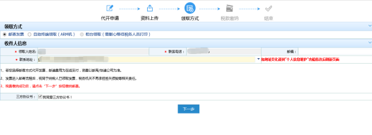 2.上述區(qū)域之外的,代開免稅貨物(勞務(wù))發(fā)票,只能選擇‘柜臺(tái)領(lǐng)取’,納稅人攜帶申報(bào)單、減免稅證明及身份證件前往辦稅服務(wù)廳領(lǐng)取發(fā)票。
