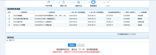 目前系統(tǒng)只支持郵寄取票方式,選擇郵寄方式時(shí)彈出郵寄協(xié)議書,點(diǎn)擊確認(rèn)后可以進(jìn)入下一步,會(huì)帶出納稅人維護(hù)的聯(lián)系地址,房屋出租代開,可以點(diǎn)擊“其他地址”,進(jìn)行填寫需要郵寄的地址。填寫地址完后點(diǎn)擊下一步,然后會(huì)彈出一個(gè)提示信息,確定后彈出“保存成功”,進(jìn)入稅款繳納界面。