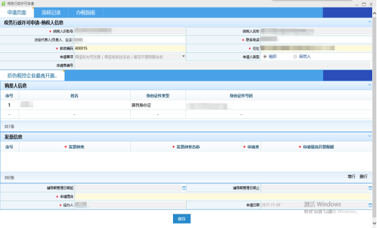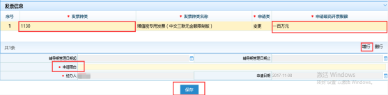 三、點(diǎn)擊發(fā)票信息右下角‘增行’按鈕,選擇發(fā)票種類,選擇申請(qǐng)最高開票限額。填寫‘申請(qǐng)理由’。確認(rèn)無誤后,點(diǎn)擊【保存】按鈕完成專票最高開票限額申請(qǐng)。