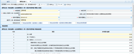 屬期為2018年6月之后,則可以正常申報(bào),錄入申報(bào)表數(shù)據(jù)項(xiàng),其中核定征收方式為“按收入總額核定應(yīng)稅所得率”,則可填報(bào)第1行至第17行;核定征收方式為“按成本費(fèi)用總額核定應(yīng)稅所得率”,則可填報(bào)第10行至第17行;征收方式為“核定應(yīng)納所得稅額”,則可填報(bào)第17行。此處截圖為征收方式為“按收入總額核定應(yīng)稅所得率”。