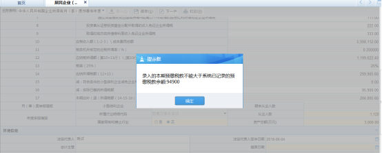 申報(bào)表16行數(shù)據(jù)自動帶出本年度已繳金額累計(jì),數(shù)值可以修改錄入,但不能小于本年度已繳金額,不能大于本年度已繳金額+上年度預(yù)繳累計(jì)多值,若超過監(jiān)控,則彈出提示,重新錄入數(shù)據(jù)。