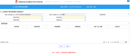 操作流程:登陸重慶市電子稅務(wù)局-我要查詢-申報(bào)信息-個(gè)人房產(chǎn)稅申報(bào)信息查詢