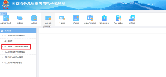操作流程:登陸重慶市電子稅務(wù)局-我要查詢(xún)-申報(bào)信息-個(gè)人所得稅12萬(wàn)自行申報(bào)信息查詢(xún)