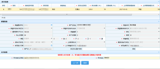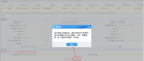 6.點擊“下一步”按鈕,進入房源信息采集頁面,系統(tǒng)自動帶出賣方共有人房源信息選擇房源并點“確定”按鈕返回房源信息頁面;