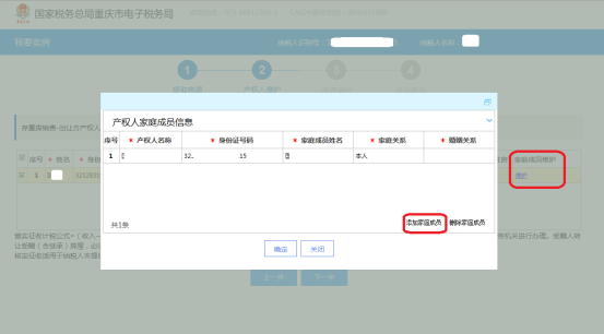 錄入產(chǎn)權(quán)人相關(guān)信息,若該房屋為滿五年家庭唯一住房,需要點(diǎn)擊“維護(hù)”進(jìn)入家庭成員維護(hù)頁(yè)面通過(guò)“添加家庭成員”維護(hù)家庭成員信息。