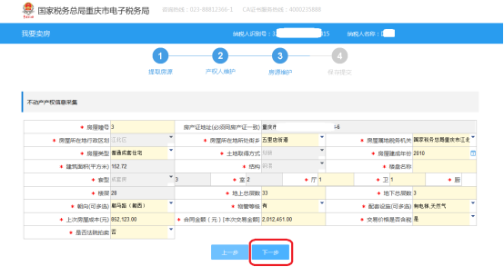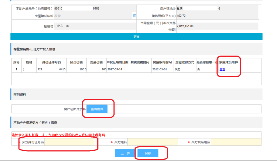 可查看本次房屋交易錄入的基本信息,也可點(diǎn)擊“上一步”重新維護(hù)。