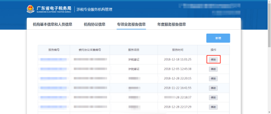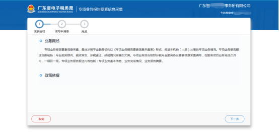 注意事項(xiàng):專項(xiàng)業(yè)務(wù)報告報送范圍包括:專業(yè)稅務(wù)顧問、稅收策劃、涉稅鑒證、納稅情況審查四大類,該四項(xiàng)專項(xiàng)業(yè)務(wù)只有稅務(wù)師事務(wù)所能做,普通機(jī)構(gòu)(即非三所)不可選擇該四大類。