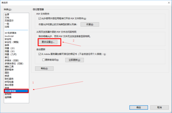 在“首選項(xiàng)”界面選擇左邊的“信任管理器”,然后點(diǎn)擊“更改設(shè)置”按鈕,選擇“允許PDF文件訪問(wèn)所有網(wǎng)站”后兩次點(diǎn)擊確定按鈕,再重新進(jìn)行申報(bào)即可。