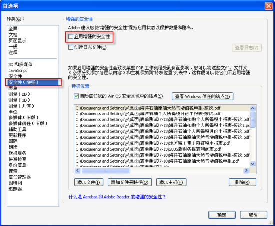 在“首選項(xiàng)”界面選擇左邊的“安全性(增強(qiáng))”去掉“啟動(dòng)增強(qiáng)的安全性”復(fù)選框前面的勾(注:本操作在同一臺(tái)電腦上只需設(shè)置一次,以后進(jìn)行申報(bào)時(shí)可不必重復(fù)操作),然后點(diǎn)擊確定。