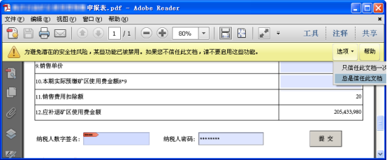 最后在申報(bào)表上方的黃色區(qū)域點(diǎn)擊信任按鈕,選擇“總是信任此文檔”,保存并覆蓋原來(lái)的文檔即可。