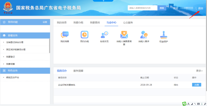 在電子稅務(wù)局,右上菜單,點(diǎn)擊退出,可以退出登錄,如圖: