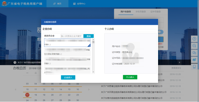 登錄成功后,跳出辦稅身份選擇,可以選擇企業(yè)身份或個(gè)人身份進(jìn)入客戶端,如圖: