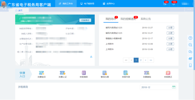 登錄成功后,我的工作臺首頁如圖,有名片,待辦通知,快捷入口,涉稅查詢等功能,可以方便相關(guān)辦稅服務(wù),名片中切換身份可以進(jìn)行身份切換,右上菜單顯示全部通知待辦數(shù)據(jù)和當(dāng)前企業(yè)名字。