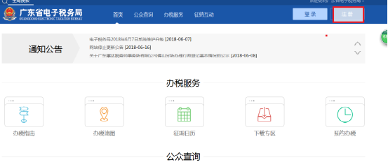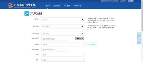 進入廣東省電子稅務(wù)局(www.etax-gd.gov.cn),申請人點擊右上角注冊按鈕,填寫個人信息,進行身份注冊。