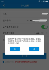 如果當(dāng)前登錄的支付寶賬號實名信息和填寫的擬實名的信息不一致,則可點擊“否”按鈕直接進行實名信息核驗,如果一致則點擊“是”,直接跳轉(zhuǎn)至支付寶進行實名信息核驗。