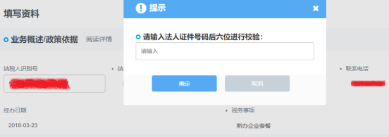 輸入納稅人識別號,按回車鍵后彈出校驗提示框,輸入法人身份證后六位,點確定,進入套餐申請主頁面。