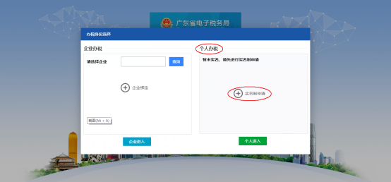 彈框自動彈出辦稅身份選擇的頁面,點擊右方“個人辦稅”下的“實名制申請”