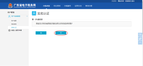 自動跳轉(zhuǎn)實名認證頁面,彈出選擇提示: 您是否已經(jīng)在稅務(wù)機關(guān)前臺進行過實名信息采集,選擇否(若您已經(jīng)在辦稅服務(wù)廳前臺進行過拍照實名,則這里選擇是)
