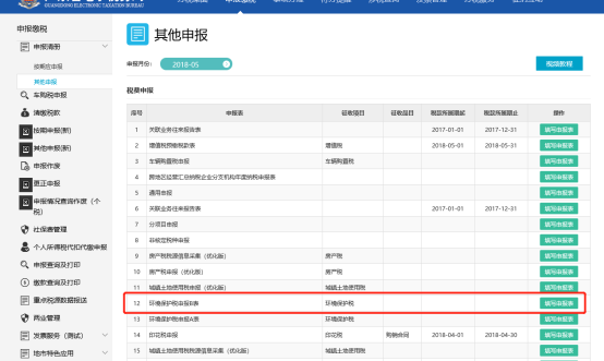 點擊菜單【申報繳稅】-【申報清冊】-【其他申報】,找到【環(huán)境保護(hù)稅基礎(chǔ)信息采集表】,點擊【填寫申報表】進(jìn)入環(huán)境保護(hù)稅基礎(chǔ)信息采集表,如下圖所示。