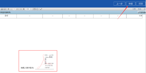 11、核對數(shù)據(jù)無誤后,若納稅人為CA用戶,則需點(diǎn)擊【納稅人數(shù)字簽名】,進(jìn)行簽名,然后點(diǎn)擊【申報(bào)】,進(jìn)行提交申報(bào)。若納稅人不為CA用戶,則無需進(jìn)行CA簽名,直接點(diǎn)擊【申報(bào)】,提交申報(bào)表。
