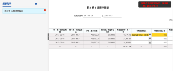 4、填寫【稅(費)通用申報表】,系統(tǒng)提供了完善的表內、表間的自動計算和校驗的功能,如校驗不通過,頁面出現黃色格子,移動鼠標至該格子,頁面顯示校驗不通過的提示。