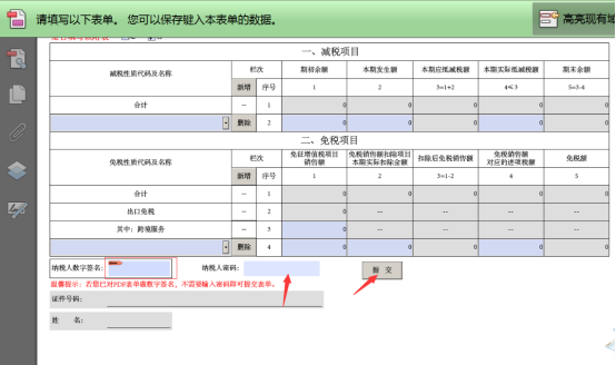 4、進入表單頁面填寫數據,核對數據無誤后,若納稅人為CA用戶,則需點擊【納稅人數字簽名】進行簽名,點擊【提交】申報。若納稅人不為CA用戶,則無需進行CA簽名,填寫【納稅人密碼】,點擊【提交】提交申報。