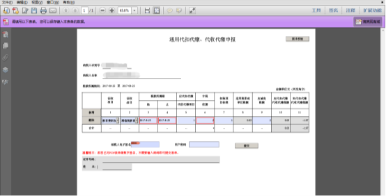 4、找到保存到電腦的申報(bào)表,用PDF格式打開(kāi)。進(jìn)入表單頁(yè)面填寫(xiě)數(shù)據(jù),核對(duì)數(shù)據(jù)無(wú)誤后,若納稅人為CA用戶,則需點(diǎn)擊【納稅人數(shù)字簽名】進(jìn)行簽名,點(diǎn)擊【提交】申報(bào)。若納稅人不為CA用戶,則無(wú)需進(jìn)行CA簽名,填寫(xiě)【納稅人密碼】,點(diǎn)擊【提交】提交申報(bào)。