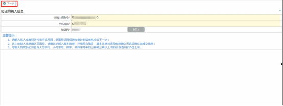 3.進(jìn)入頁面后輸入納稅人識(shí)別號(hào),法人或財(cái)務(wù)負(fù)責(zé)人手機(jī)號(hào)碼,點(diǎn)擊“獲取驗(yàn)證碼”,此時(shí)會(huì)向輸入的手機(jī)號(hào)發(fā)送一條包含驗(yàn)證碼的短信,輸入驗(yàn)證碼后點(diǎn)擊“下一步”。