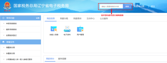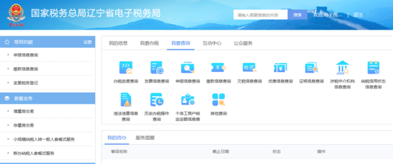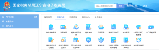 左側(cè)的功能區(qū)分為“常用功能”、“套餐業(yè)務(wù)”、“特色業(yè)務(wù)”。常用功能模塊,納稅人通過“設(shè)置”按鈕,可以編輯增加自己的常用功能,以便后期使用。“套餐業(yè)務(wù)”、“特色業(yè)務(wù)”為遼寧稅務(wù)為納稅人提供的一些主要的固有或特有功能。