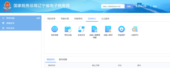 互動(dòng)中心為納稅人與稅務(wù)機(jī)關(guān)實(shí)現(xiàn)互聯(lián)互通、在線交互。目前主要提供我的消息、預(yù)約辦稅、在線交互、納稅人滿意度調(diào)查、納稅人需求、權(quán)益保護(hù)、辦稅評(píng)價(jià)等功能。