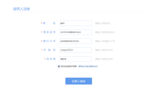 2.打開頁面后輸入“姓名”,“身份證號(hào)”,“銀行卡號(hào)”,“手機(jī)號(hào)”,“出生地”,銀行卡號(hào)必須為本人開通,手機(jī)號(hào)為開通銀行卡時(shí)預(yù)留手機(jī)號(hào)。
