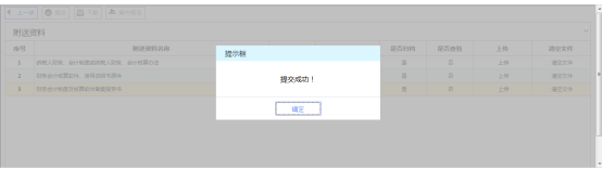 6、 附列資料逐個(gè)上傳完畢,點(diǎn)擊“提交”按鈕,系統(tǒng)將提示提交成功,該申請(qǐng)?zhí)峤坏蕉悇?wù)機(jī)關(guān)系統(tǒng)中,申請(qǐng)操作全部完成。