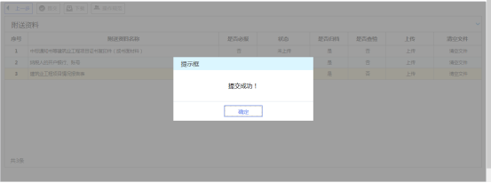 5、 附列資料逐個上傳完畢,點擊“提交”按鈕,系統(tǒng)將提示提交成功,該申請?zhí)峤坏蕉悇?wù)機關(guān)系統(tǒng)中,申請操作全部完成。