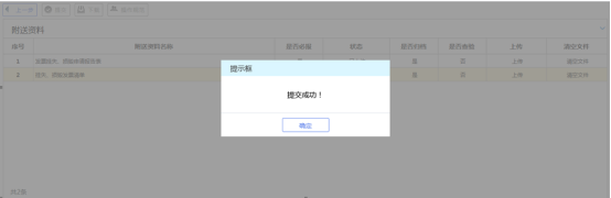 6     附列資料逐個(gè)上傳完畢,點(diǎn)擊 “提交”按鈕,系統(tǒng)將提示提交成功,該申請(qǐng)?zhí)峤坏蕉悇?wù)機(jī)關(guān)系統(tǒng)中,申請(qǐng)操作全部完成。