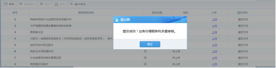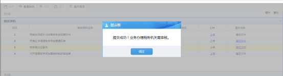 4、 附列資料逐個上傳完畢,點(diǎn)擊 “提交”按鈕,系統(tǒng)將提示提交成功,該申請?zhí)峤坏蕉悇?wù)機(jī)關(guān)系統(tǒng)中,申請操作全部完成。