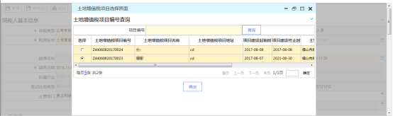 (2)若選擇“土地增值稅項(xiàng)目”,系統(tǒng)帶出不動(dòng)產(chǎn)項(xiàng)目信息選擇頁面,操作人員勾選或者通過項(xiàng)目編號(hào)查詢需要申報(bào)的不動(dòng)產(chǎn)信息,確認(rèn)后點(diǎn)擊 “確定”帶回主頁面。