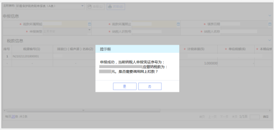 3、 附表填寫完成后,點擊主附表樹回到“環(huán)境保護稅納稅申報表(A表)”,點擊“申報”,提示申報成功,保存相關信息進行申報,點擊“是”按鈕跳轉到【稅費申報及繳納】—【稅(費)繳納】—【聯合繳款】頁面進行繳稅。