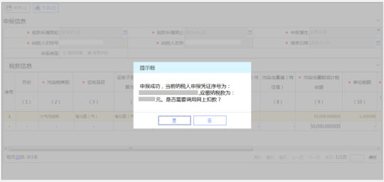 2、 點(diǎn)擊“增行”,根據(jù)業(yè)務(wù)需要填寫(xiě)稅款信息,點(diǎn)擊“申報(bào)”按鈕,系統(tǒng)提示,申報(bào)成功,提示是否進(jìn)行網(wǎng)上扣款。點(diǎn)擊 “是”按鈕跳轉(zhuǎn)到【稅費(fèi)申報(bào)及繳納】—【稅(費(fèi))繳納】—【聯(lián)合繳款】頁(yè)面進(jìn)行繳稅。
