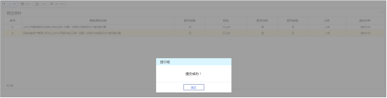 6、 附列資料逐個(gè)上傳完畢,點(diǎn)擊“提交”按鈕,系統(tǒng)將提示提交成功,該申請(qǐng)?zhí)峤坏蕉悇?wù)機(jī)關(guān)系統(tǒng)中,申請(qǐng)操作全部完成。