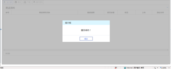 4、 點擊“下一步”跳轉(zhuǎn)至上傳附送資料頁面,本功能無需提交附列資料,點擊“提交”,系統(tǒng)將提示提交成功,該申請?zhí)峤坏蕉悇?wù)機關(guān)系統(tǒng)中,申請操作全部完成