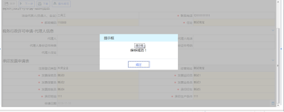 2、 填寫(xiě)“稅務(wù)行政許可申請(qǐng)-組織信息”欄中的必填項(xiàng)和“承印發(fā)票申請(qǐng)表” 欄中的必填項(xiàng),點(diǎn)擊“保存”按鈕,提示保存成功后,點(diǎn)擊“確定”。