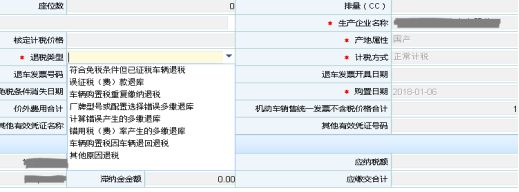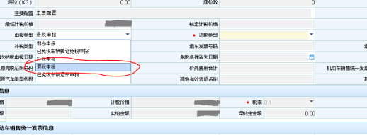 2、 退稅類型選擇“車輛購置稅因車輛退回退稅”,要填寫“退車發(fā)票號碼”、選擇“退車發(fā)票開具日期”