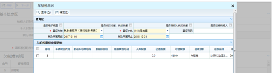 2、 點(diǎn)擊 “查詢”,可查詢已申報(bào)的全部車船稅信息,輸入查詢條件后,點(diǎn)擊 “查詢”,選擇要退抵稅的車船稅信息,點(diǎn)擊“確定”,將數(shù)據(jù)帶入頁面。